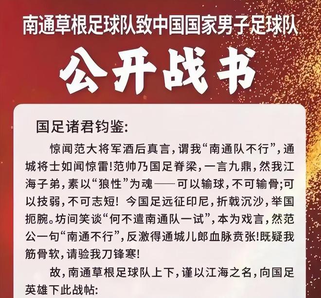 然后,“戰(zhàn)書”風(fēng)波就來了,不知道哪位網(wǎng)友用了AI還是手打,搞出一份“南通挑戰(zhàn)國足”的公開戰(zhàn)書,措辭古風(fēng),架勢(shì)十足,熱度蹭地一下飆上來,圍觀群眾一片叫好,不明真相的差點(diǎn)就信了。