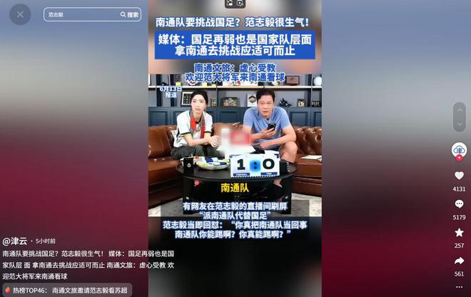 和很多人想的一樣,真有人往直播間刷屏讓南通隊(duì)上場(chǎng)代替國足,一次、兩次、十幾次,最后范志毅終于忍不了,直接火了,直言別太把南通當(dāng)回事”,這話不是貶低南通,而是對(duì)一幫球迷情緒性起哄的怒懟。