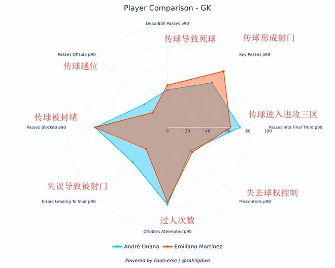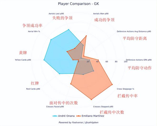 上圖可以很清晰看到奧納納、馬丁內(nèi)斯在對(duì)抗數(shù)據(jù)和活動(dòng)范圍的差別。球隊(duì)的風(fēng)格是不同的,奧納納面對(duì)的傳中次數(shù)更少,但是從平均數(shù)看,馬丁內(nèi)斯對(duì)傳中球的控制,的確比奧納納強(qiáng)了一籌,對(duì)照比賽的印象,就是曼聯(lián)本賽季丟了不少角球。整體上,馬丁內(nèi)斯在活動(dòng)范圍方面,也比奧納納更加好一些。