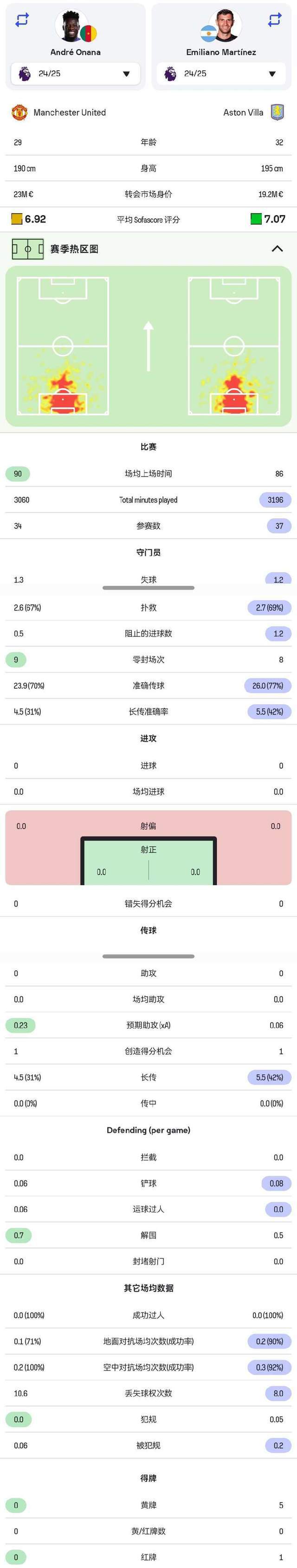 上圖應(yīng)該是比較直觀的數(shù)據(jù)對(duì)比了,奧納納面對(duì)的射正次數(shù)更多,但是奧納納的失球數(shù)比馬丁內(nèi)斯略少一些。維拉本賽季丟了51球、曼聯(lián)本賽季丟了54球,但是奧納納比馬丁內(nèi)斯少踢了3場(chǎng)英超比賽。