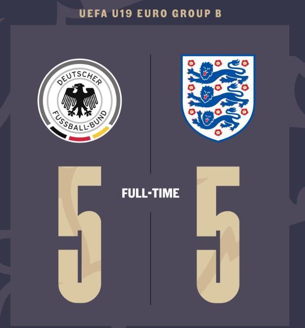 英格蘭U19對陣德國U19的比賽中,前者曾一度以1-5的比分落后,但他們上演了絕地反擊最終將比分扳成了5-5的平手。