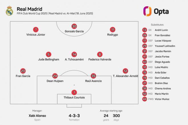 據(jù)opta數(shù)據(jù)統(tǒng)計,本場比賽阿隆索排出的皇馬首發(fā)11人平均年齡24歲300天,是自09-10賽季以來新教練執(zhí)教皇馬首戰(zhàn)中最年輕的首發(fā)陣容。