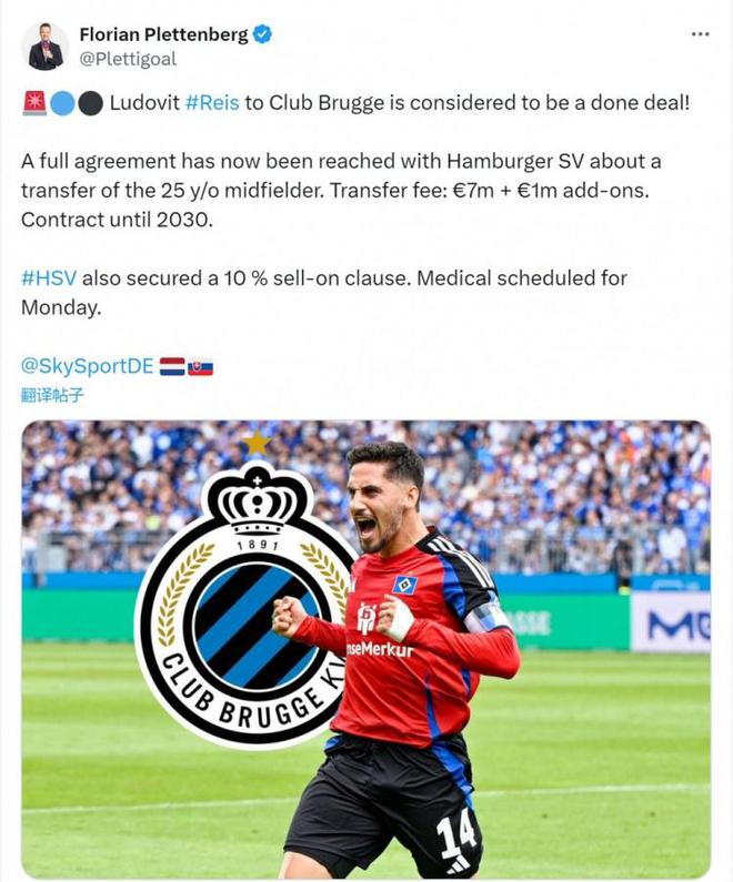 普萊滕伯格透露,布魯日已經(jīng)與漢堡就雷斯的轉(zhuǎn)會(huì)達(dá)成全面協(xié)議,轉(zhuǎn)會(huì)費(fèi)為700萬歐加100萬歐浮動(dòng),包含10%的轉(zhuǎn)售分成條款。雷斯將在下周一接受布魯日體檢,然后簽約至2030年。