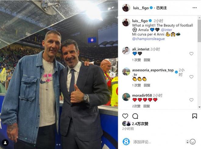 見證國米晉級!菲戈曬與馬特拉齊合照:美妙的夜晚,足球的魅力