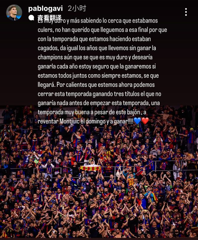 5月8日歐冠日報宣報訊 歐冠半決賽次回合,巴薩3-4不敵國米,遺憾無緣本賽季的歐冠決賽。巴薩中場加維賽后在自己的社媒發(fā)文談到了這場比賽。