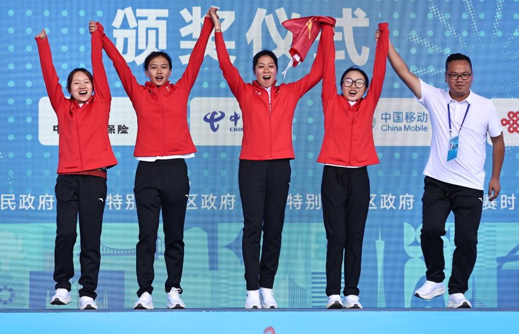5月8日,冠軍廣東隊在女子定向接力賽頒獎儀式上慶祝。體育日報記者 黃國保 攝