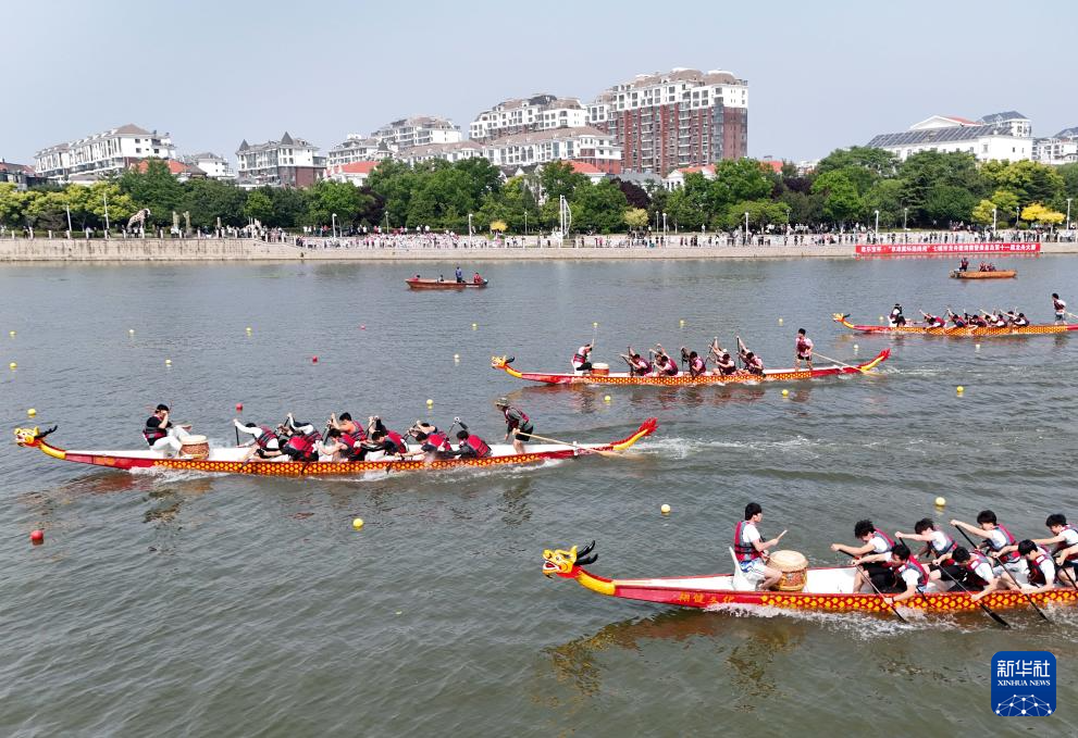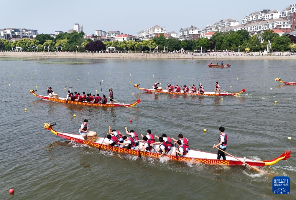 5月29日,參賽隊(duì)伍在12人龍舟100米比賽中(無人機(jī)照片)。