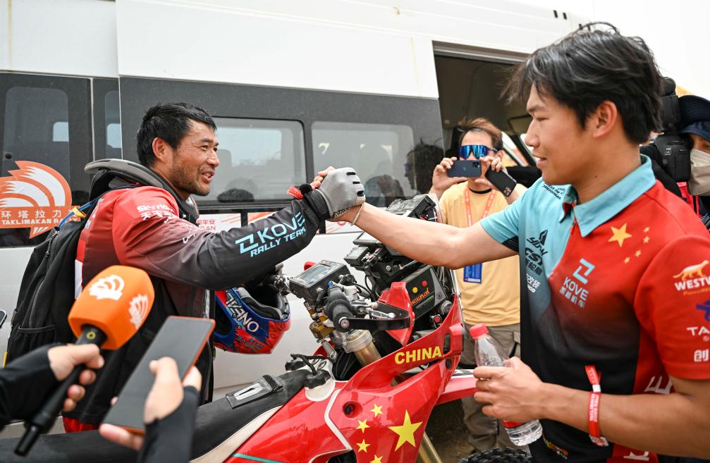 2023年5月23日,在當年的環(huán)塔拉力賽上,方明集(左)抵達終點后,與稍早完賽的兒子方響量握手慶祝。體育日報記者 胡虎虎 攝