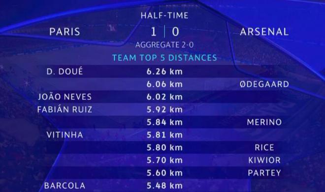 巴黎邊鋒杜埃是兩隊半場跑動最多的球員,跑動距離6.26km。