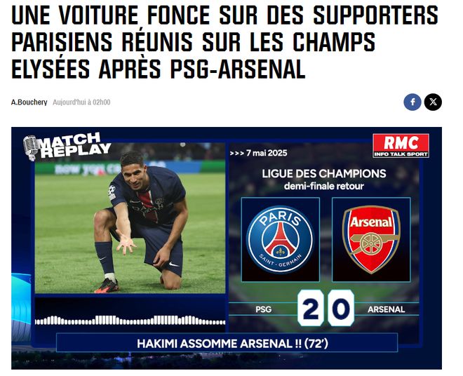 5月8日英超日?qǐng)?bào)宣報(bào)訊 根據(jù)法國(guó)媒體《RMC》的報(bào)道,歐冠半決賽,大巴黎淘汰阿森納之后,一輛汽車沖到在香榭麗舍大道慶祝的巴黎球迷人群中,導(dǎo)致多人受傷,其中1人傷勢(shì)較重。由于大巴黎球迷的過激慶祝行為,大約有19人被逮捕。