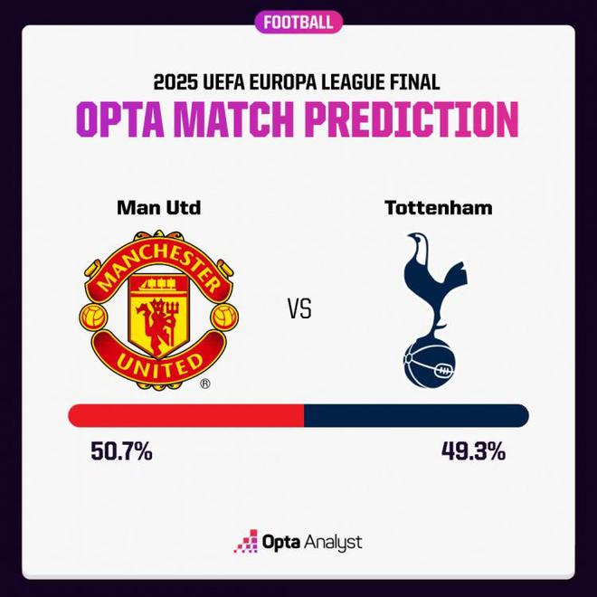 五五開!Opta超算預(yù)測(cè)歐聯(lián)杯決賽勝率:曼聯(lián)50.7%,熱刺49.3%