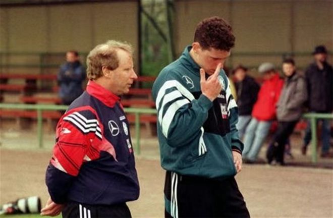 要知道,1997年前后的博比奇,已經(jīng)在德甲聯(lián)賽證明自己的實(shí)力了。1995—96賽季以及1996—97賽季,博比奇的聯(lián)賽進(jìn)球數(shù),都在鄧迪之上??墒牵┍绕嬖诘聡?guó)隊(duì)的處境并不算好。