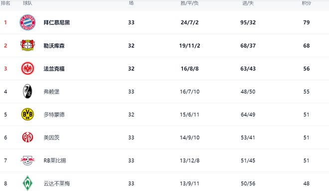 在積分榜上,冠軍球隊(duì)拜仁拿到79分。勒沃庫(kù)森以68分排名第2。法蘭克福56分排名第3。第4的是弗賴堡這匹黑馬,拿到55分。弗賴堡與歐冠資格越來(lái)越近了。而多特蒙德只拿到51分,排名第5。美因茨和萊比錫也都是51個(gè)積分。