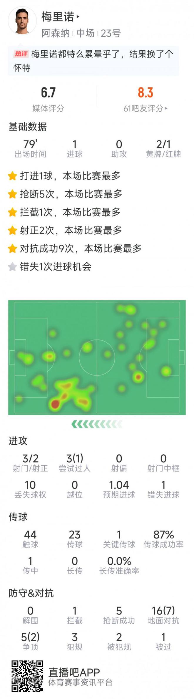 梅里諾本場(chǎng)數(shù)據(jù):1粒進(jìn)球,3射2正,5次搶斷,2黃被罰下