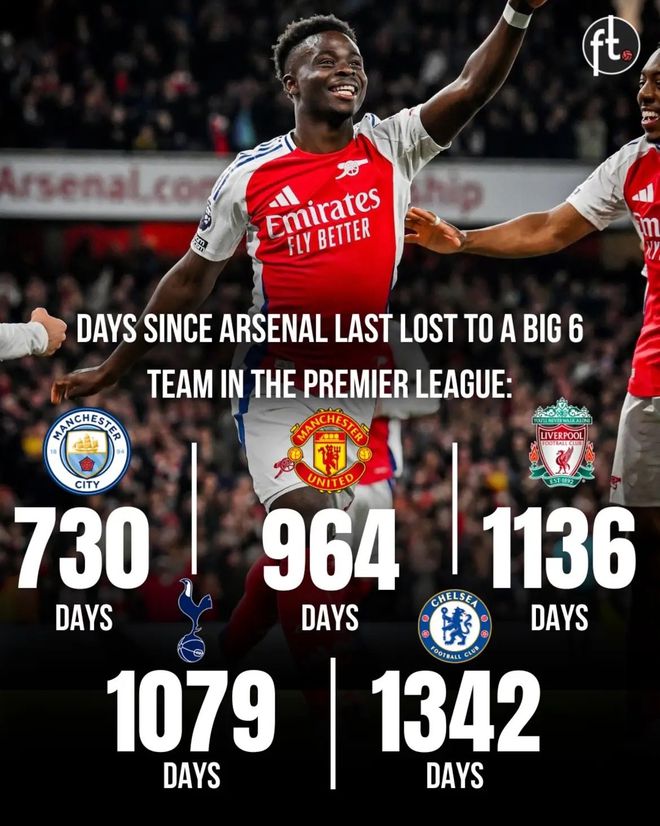數(shù)據(jù)顯示,阿森納上一次輸給曼城是730天之前,上一次輸給曼聯(lián)是964天之前,最近一次輸給利物浦是1136天之前,上一次輸給熱刺是1079天之前,而上一次輸給切爾西則是1342天之前。