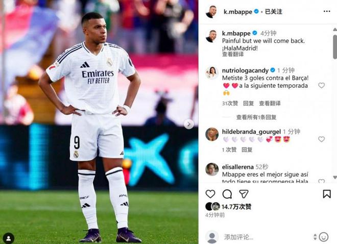 姆巴佩在個人社媒曬出本場照片,配文寫道:“雖然傷心,但是我們會重振旗鼓,Hala Madrid!”