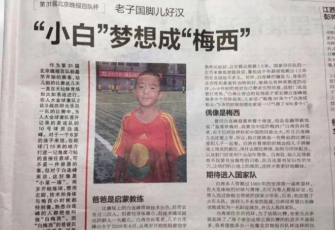 早在10年前,當時年僅6歲的白連峰就在北京地區(qū)舉辦的百隊杯上有過不錯的發(fā)揮?;蛟S是遺傳了爸爸的運動天賦,白濤表示兒子身體的爆發(fā)力、靈活性和柔韌性都特別好,5歲時就能一口氣做400多個俯臥撐。那時候,在被問到自己的偶像時,白連峰大聲說道:“最喜歡梅西,我要當中國的梅西!”