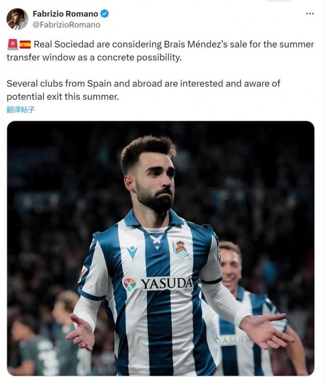 5月13日西甲日?qǐng)?bào)宣報(bào)訊 據(jù)知名記者羅馬諾報(bào)道,皇家社會(huì)正在考慮今夏出售布萊斯-門德斯。