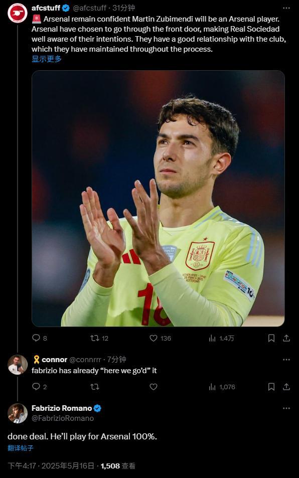 羅馬諾表示:交易已完成,祖比門迪100%會(huì)為阿森納效力。