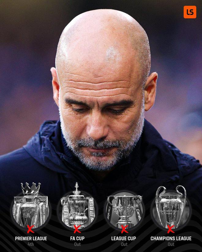 曼城單賽季無緣英超、歐冠、足總杯、聯(lián)賽杯,這是自2017年后的首次。