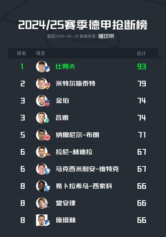 2024/25德甲搶斷榜:比朔夫93次斷層領跑