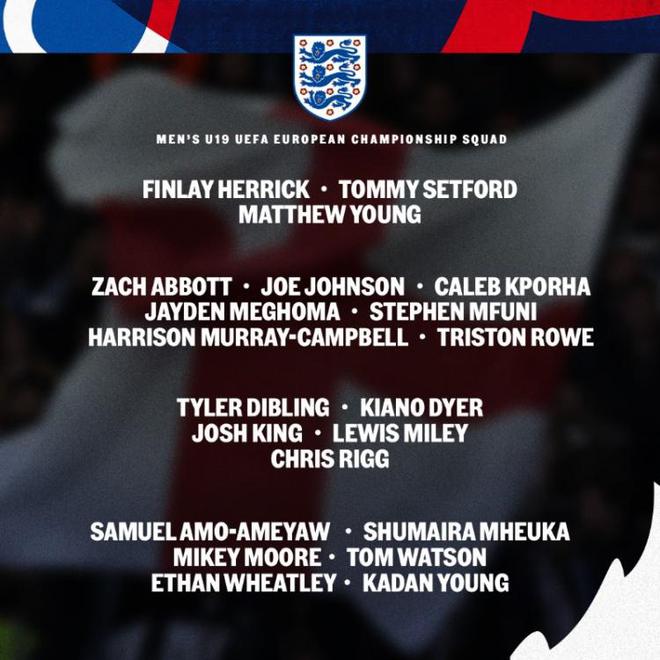 5月19日英超日報宣報訊 英格蘭隊公布U19歐青賽名單,迪布林、戴爾、里格、惠特利在列。今年歐青賽將于6月在羅馬尼亞拉開帷幕,英格蘭隊小組賽6月14日對陣挪威隊、17日對陣德國隊、20日對陣荷蘭隊。