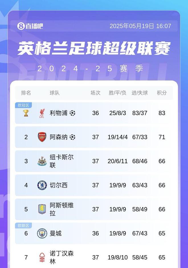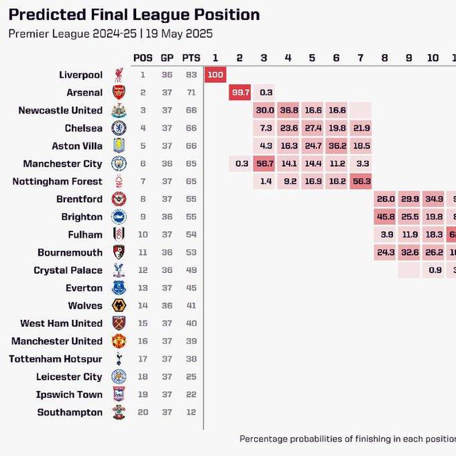 05月19日英超日?qǐng)?bào)宣報(bào)訊 Opta預(yù)測(cè)英超各支球隊(duì)前五概率: