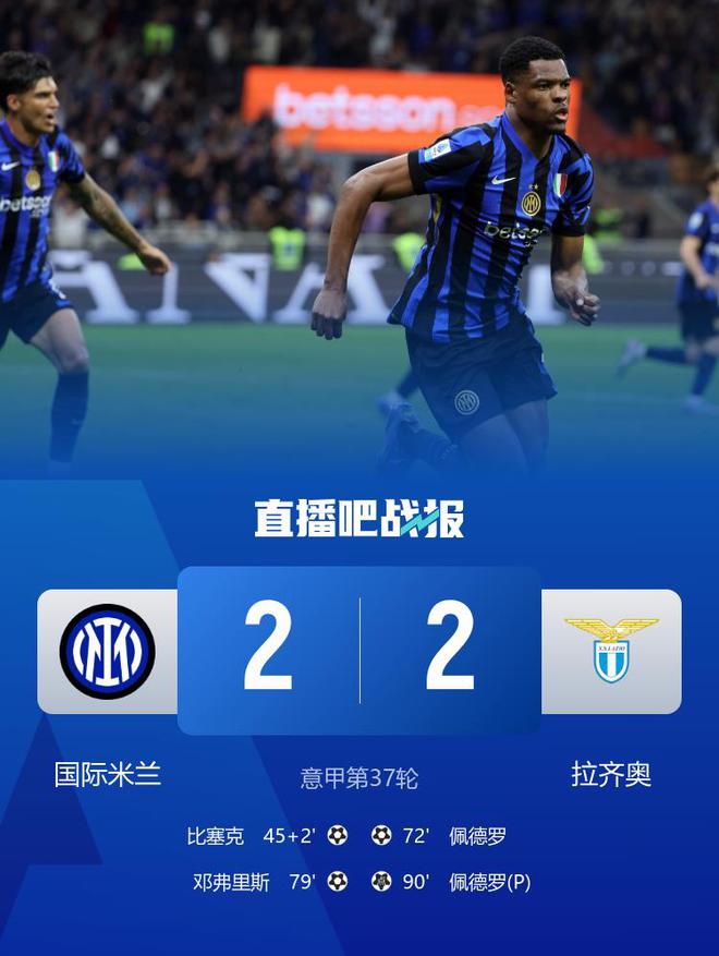 意甲聯(lián)賽第37輪,國米2-2遭拉齊奧絕平,佩德羅梅開二度,比塞克進(jìn)球+送點。