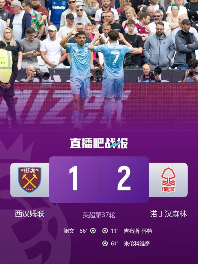 5月18日英超日報宣報訊 北京時間5月18日晚上21:05,英超第37輪,西漢姆聯(lián)坐鎮(zhèn)倫敦碗球場迎戰(zhàn)諾丁漢森林。上半場,阿雷奧拉送大禮、吉布斯-懷特笑納,克里斯-伍德中框。下半場,米倫科維奇頭球破門,鮑文凌空斬。全場結束,西漢姆聯(lián)1-2諾丁漢森林。本場過后,諾丁漢森林積65分排名第7,西漢姆聯(lián)積40分排名第15。