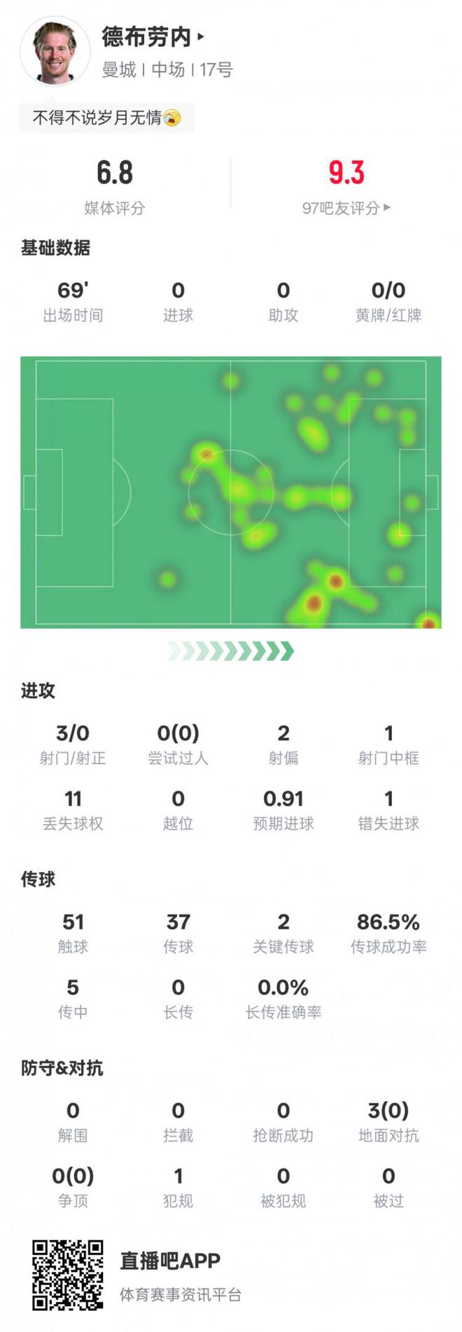 德布勞內(nèi)主場(chǎng)告別戰(zhàn)數(shù)據(jù):2關(guān)鍵傳球&錯(cuò)失1次進(jìn)球機(jī)會(huì),評(píng)分6.8