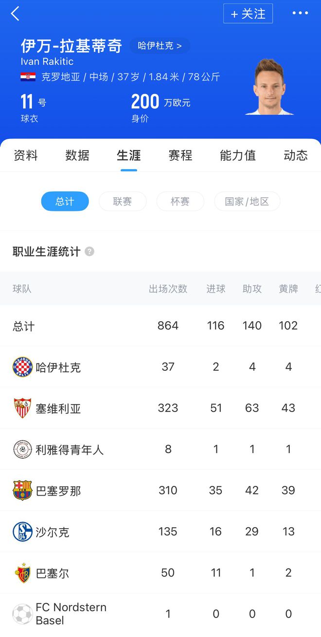 拉基蒂奇現(xiàn)年37歲,職業(yè)生涯曾先后效力巴塞爾、沙爾克、巴薩、塞維利亞、利亞德青年人以及哈伊杜克。他代表克羅地亞出戰(zhàn)上百場,被譽(yù)為克羅地亞歷史上最優(yōu)秀的球員之一,曾隨巴薩奪得過歐冠、西甲、世俱杯等重要榮譽(yù),2015年他幫助巴薩問鼎三冠王,2018年他還隨克羅地亞闖入過世界杯決賽。