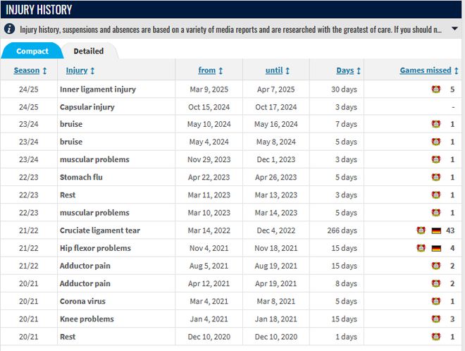 傷病史:21-22賽季ACL缺席大部分比賽,其他賽季都出勤良好,24-25賽季曾因內(nèi)側(cè)韌帶損傷缺席一個月。