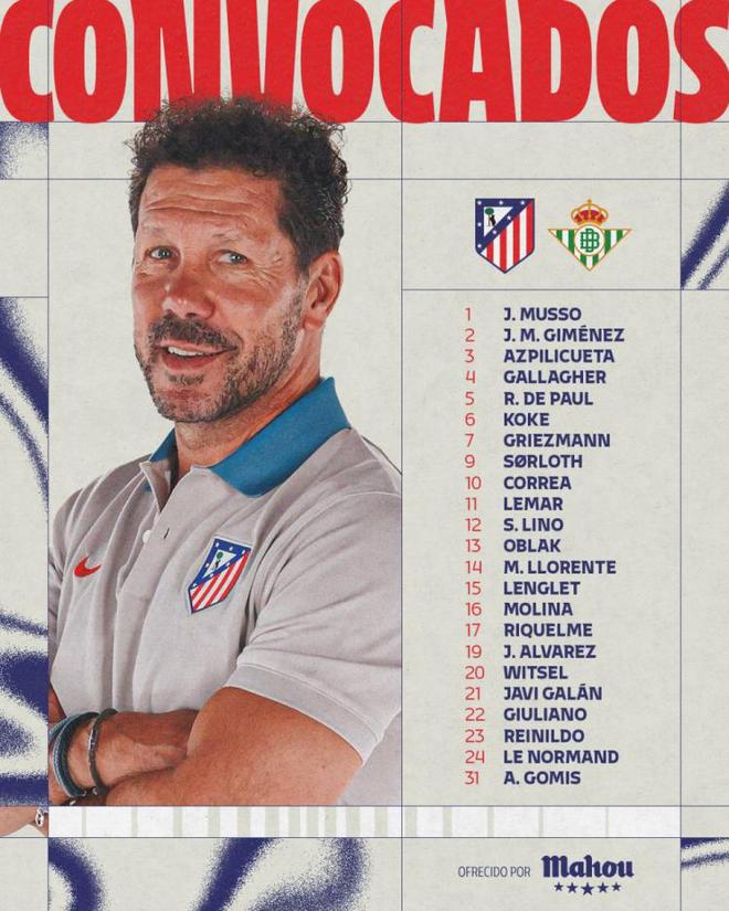 馬競(jìng)對(duì)陣貝蒂斯名單:格列茲曼、索爾洛特、德保羅、小蜘蛛在列