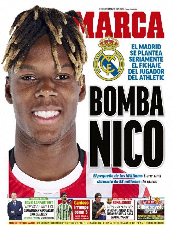 據(jù)2025年5月21日西甲日?qǐng)?bào)宣報(bào)《馬卡報(bào)》的報(bào)道,皇家馬德里正在考慮簽下畢爾巴鄂競(jìng)技隊(duì)的年輕邊鋒尼科·威廉姆斯,以增強(qiáng)下賽季球隊(duì)的攻擊力。轉(zhuǎn)會(huì)市場(chǎng)逐漸升溫,而尼科·威廉姆斯成為了眾多關(guān)注焦點(diǎn)中的一個(gè)。