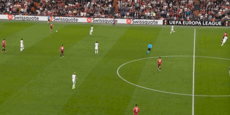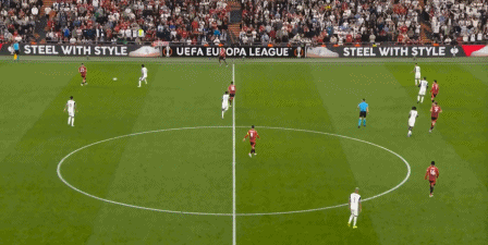 所以在這場比賽,你經(jīng)??梢钥吹铰?lián)在有球時(shí)的如此站位: