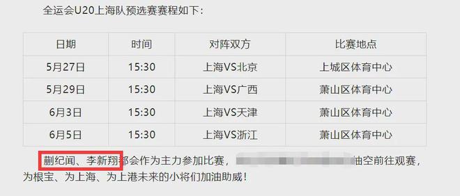 根據(jù)上海博主的爆料,海港隊的蒯紀(jì)聞、李新翎在結(jié)束足協(xié)杯賽事后,將回歸徐根寶執(zhí)教的上海U20全運隊,并將隨隊征戰(zhàn)5月27日,在杭州開始的全運會預(yù)選賽。