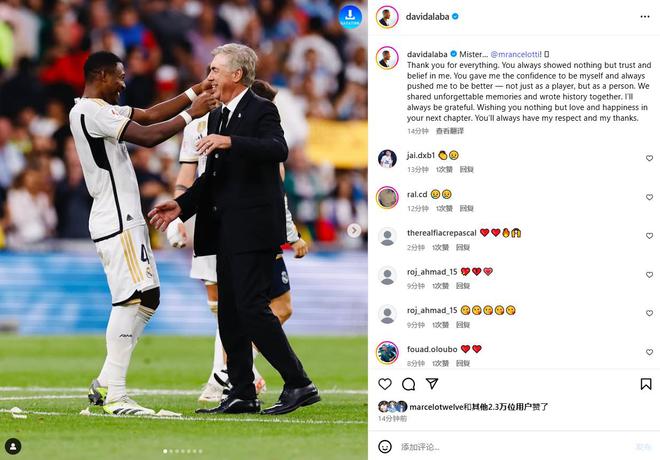 阿拉巴更新社交媒體曬照發(fā)文告別安切洛蒂。