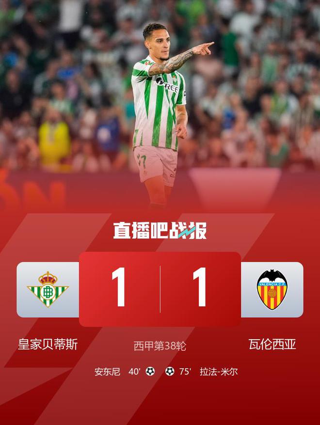4輪不勝!貝蒂斯1-1瓦倫西甲第6收官 安東尼兜射破門+表白貝蒂斯