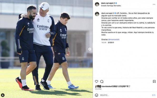 卡瓦哈爾社媒告別安切洛蒂:既是皇馬的傳奇,亦是一位非凡之人