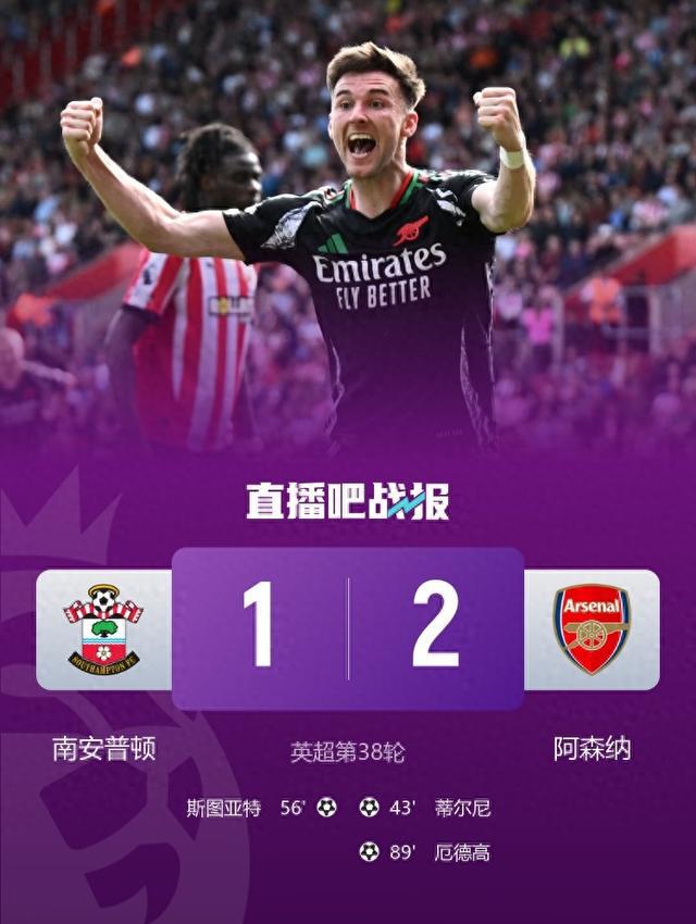 5月26日英超日報宣報訊 北京時間5月25日23:00,英超第38輪,阿森納做客圣瑪麗球場挑戰(zhàn)南安普頓。上半場,梅里諾頭球擊中橫梁,馬丁內(nèi)利單刀打門被撲出,蒂爾尼搶點破門。下半場,斯圖亞特頭球扳平比分,薩卡補射破門但越位在先,厄德高禁區(qū)外遠射絕殺。全場比賽結(jié)束,阿森納客場2-1戰(zhàn)勝南安普頓。最終,阿森納20勝14平4負,積74分排在積分榜次席;南安普頓2勝6平30負,積12分排在榜尾。