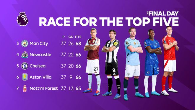 英超末輪歐冠資格爭奪實時:目前曼城、紐卡、切爾西將晉級歐冠