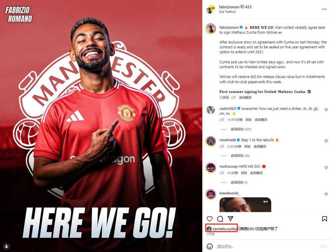 羅馬諾在社交媒體上以標(biāo)志性的“Here we go”透露,曼聯(lián)簽下狼隊前鋒庫尼亞,解約金6250萬英鎊分期支付,庫尼亞的父親為羅馬諾的這條動態(tài)點贊。