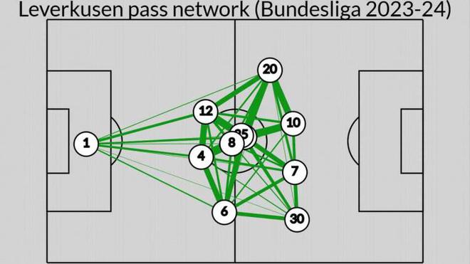 2023/2024賽季勒沃庫(kù)森的傳球網(wǎng)絡(luò)示意