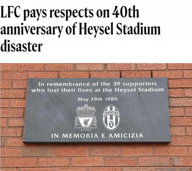 5月29日英超日?qǐng)?bào)宣報(bào)訊 利物浦官方紀(jì)念了海瑟爾慘案40周年,緬懷39名遇難球迷。