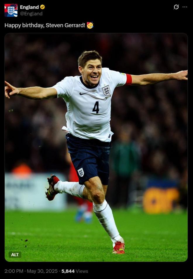 英格蘭社媒寫(xiě)道:“生日快樂(lè),史蒂文-杰拉德”