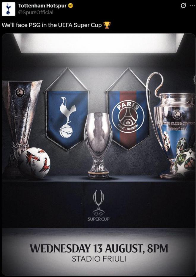 巴黎將在歐洲超級杯對陣本賽季歐聯(lián)杯冠軍熱刺,熱刺官推曬出兩隊對陣海報預熱,比賽時間將在8月13日。