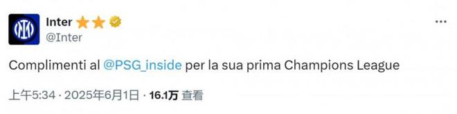 國米官方社媒發(fā)文:“祝賀巴黎首次贏得歐冠冠軍?!?/p>