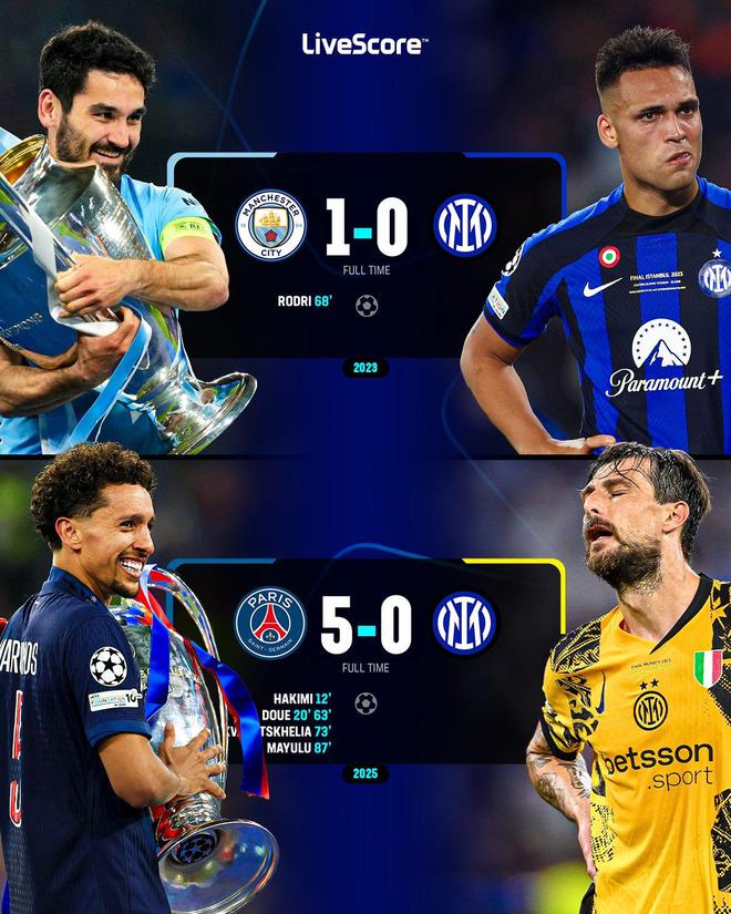 昨日重現(xiàn)國(guó)米3年2進(jìn)歐冠決賽 見(jiàn)證曼城和巴黎圓夢(mèng)&加冕三冠王