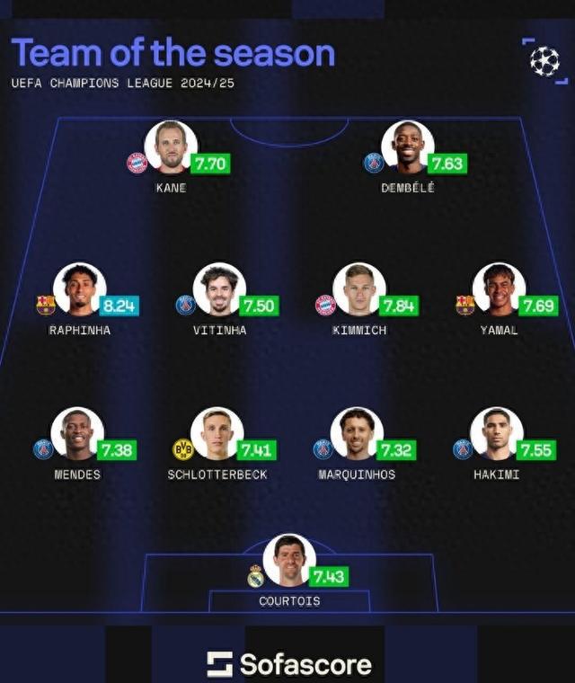 Sofa評本賽季歐冠最佳陣:登貝萊領(lǐng)銜巴黎5人,亞馬爾、凱恩在列