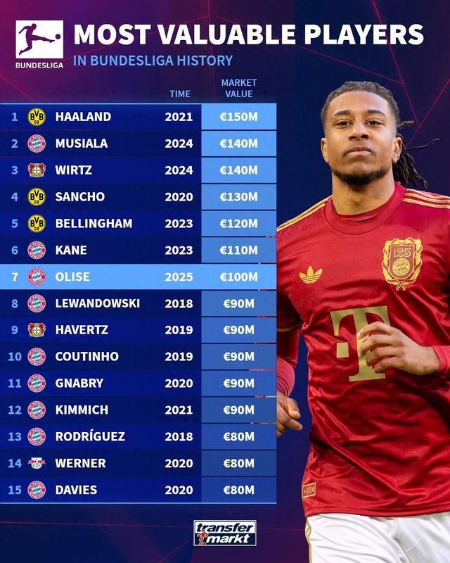奧利塞身價(jià)達(dá)到1億歐元,列德甲歷史球員身價(jià)榜第七